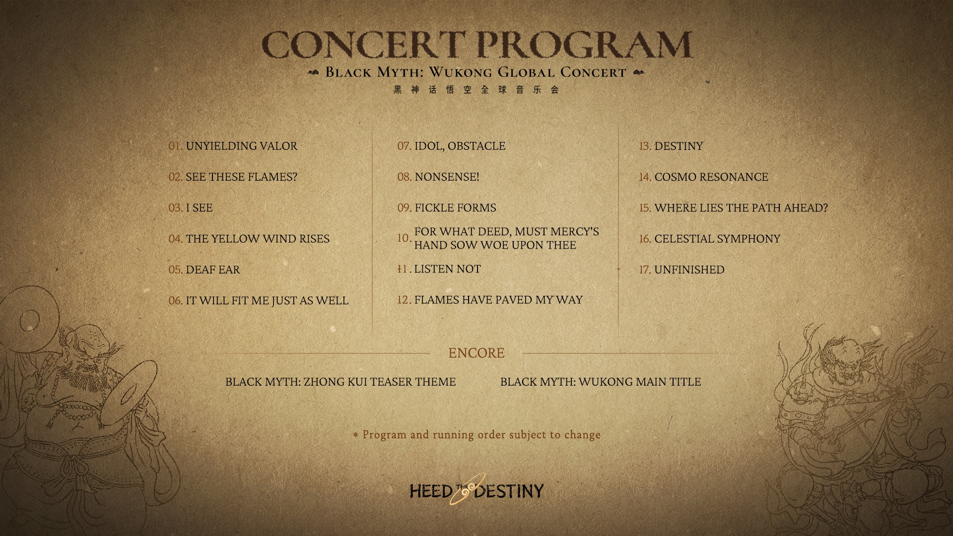 อัปเดตรายชื่อเพลง — ทัวร์คอนเสิร์ตปี 2026 ได้มีการปรับเปลี่ยนรายชื่อเพลงจากคอนเสิร์ตครั้งก่อนในจีนแผ่นดินใหญ่ โดยจะเพิ่มเพลง “เสียงสวรรค์วังเมฆา” และ “ถามวิถีอยู่หนใด” ในเวอร์ชัน Black Myth: Wukong เข้ามาในรายชื่อเพลงเป็นครั้งแรก นอกจากนี้ นักร้องต้นฉบับของหลายเพลงในเกม Black Myth: Wukong ก็จะเข้าร่วมทัวร์ทั่วโลกครั้งนี้ด้วย เพื่อมอบประสบการณ์เสียงร้องต้นฉบับที่ไม่เหมือนใครจากในเกม