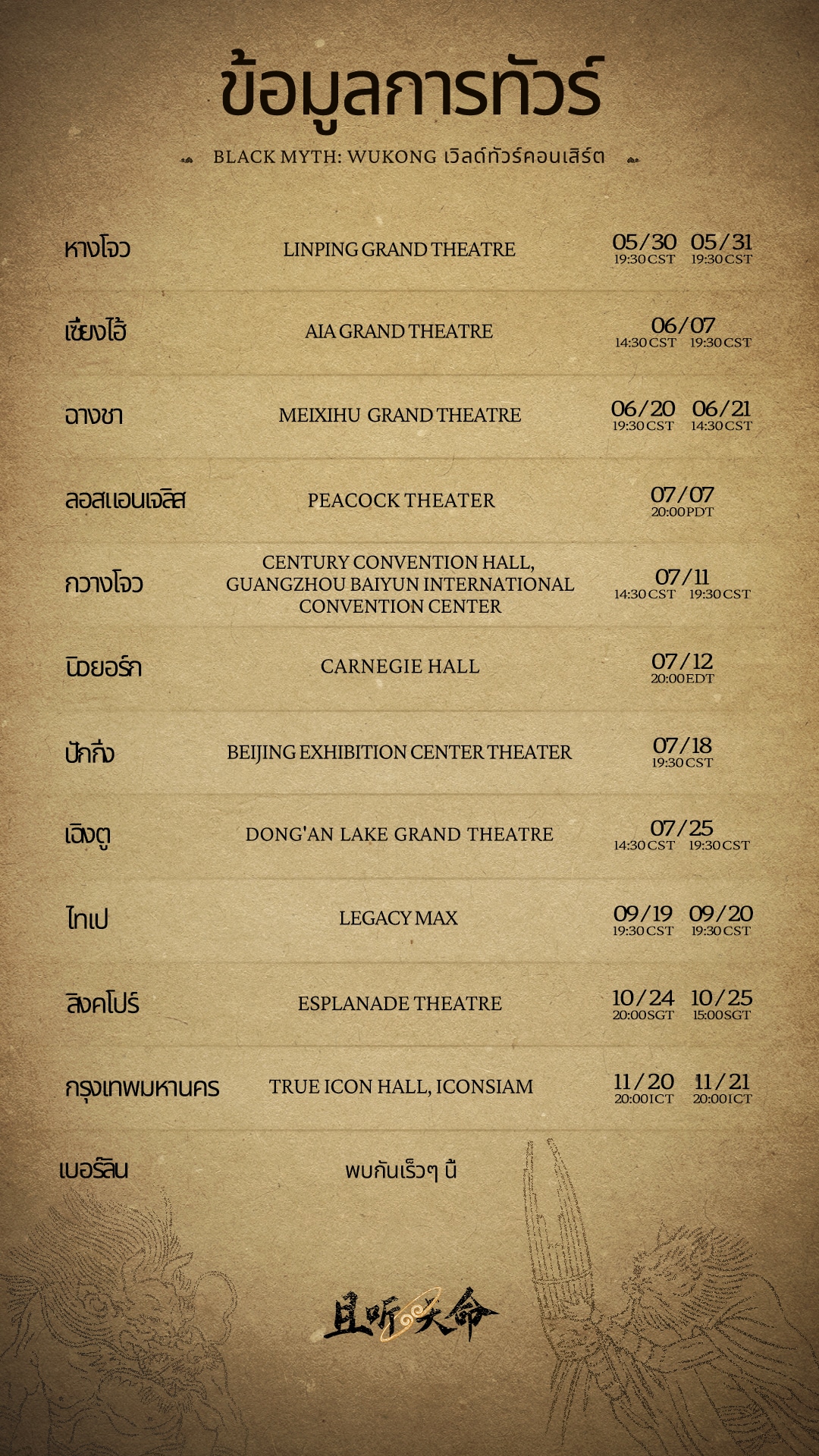 ตามบรรเลงเพลงสู่ประจิม จงรับฟังลิขิตแห่งสวรรค์ “Black Myth: Wukong” จับมือกับวงดนตรีมืออาชีพทั่วโลก คัดสรรสถานที่จัดคอนเสิร์ตระดับชั้นนำ เพื่อมอบประสบการณ์การแสดงระดับมืออาชีพและสุดตระการตาให้กับผู้รับลิขิตสวรรค์ทุกท่านในทัวร์คอนเสิร์ตของ Black Myth: Wukong ซึ่งทัวร์ครั้งนี้จะจัดขึ้นทั้งหมด 21 รอบใน 12 เมือง สามารถดูข้อมูลของเมืองและสถานที่จัดงาน (เรียงตามวันที่จัดแสดง) ได้จากภาพด้านล่าง โดยจะเปิดจำหน่ายบัตรคอนเสิร์ตตามกำหนดการของแต่ละรอบต่อไปนี้