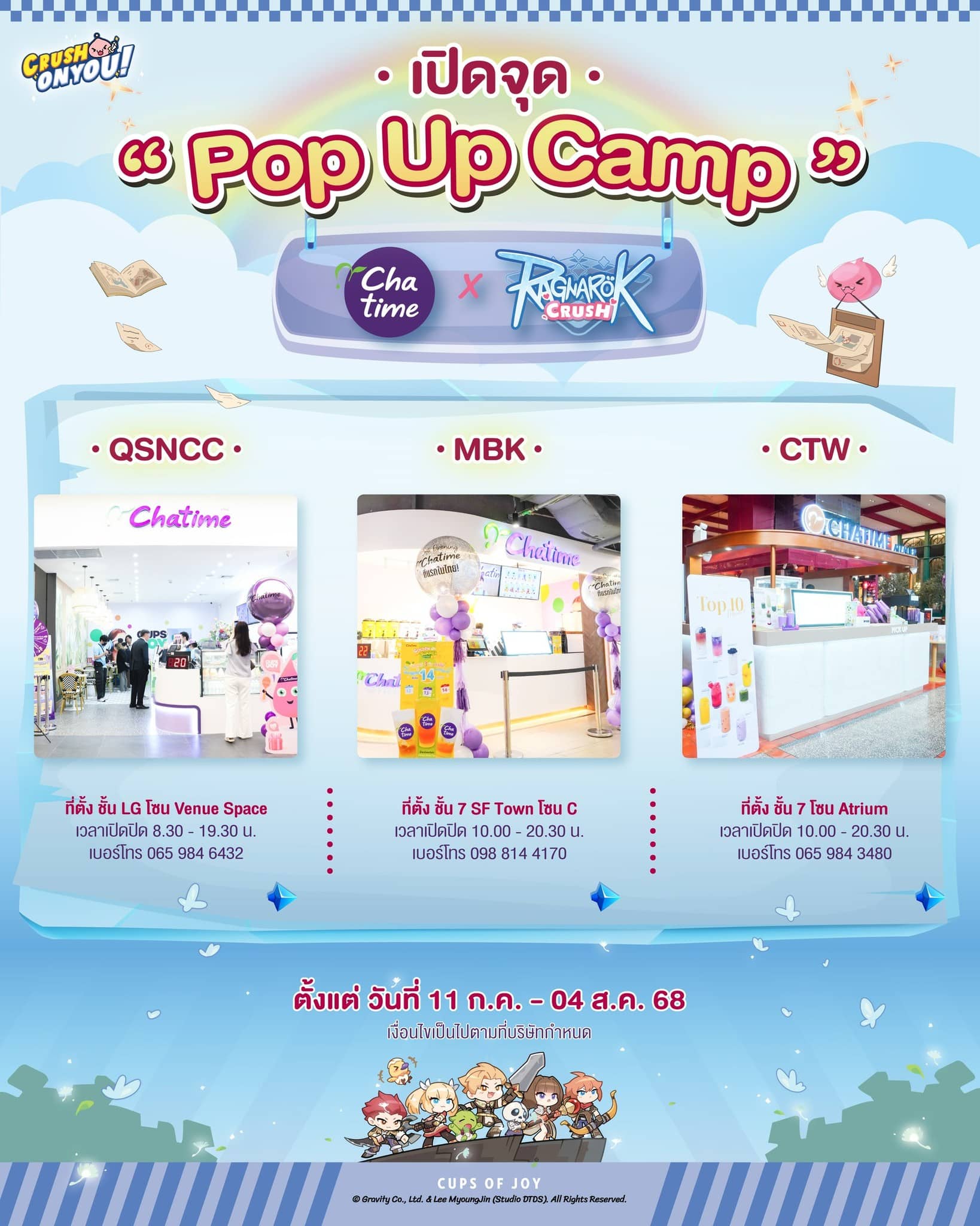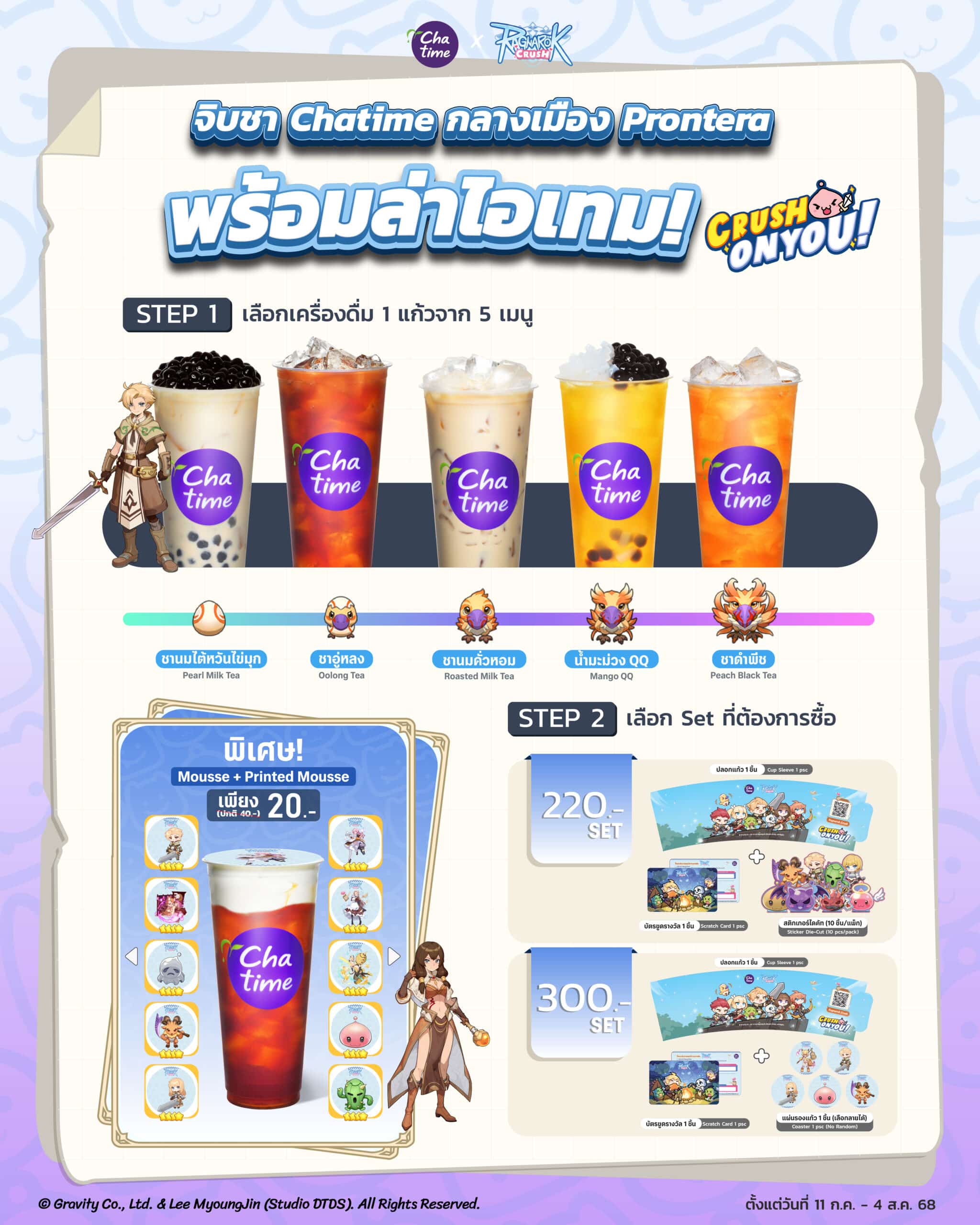 กิจกรรมคอลแลป Chatime x Ragnarok Crush จะเริ่มอย่างเป็นทางการในวันที่ 11 กรกฏาคมนี้ จนถึง 4 สิงหาคม 2568 ผู้เล่นและแฟนๆ Ragnarok เตรียมตัวไปตามหาของสะสมกันได้เลย สามารถติดตามข้อมูลเพิ่มเติมหรือสอบถามได้ที่ช่องทางติดตาม Chatime Thailand