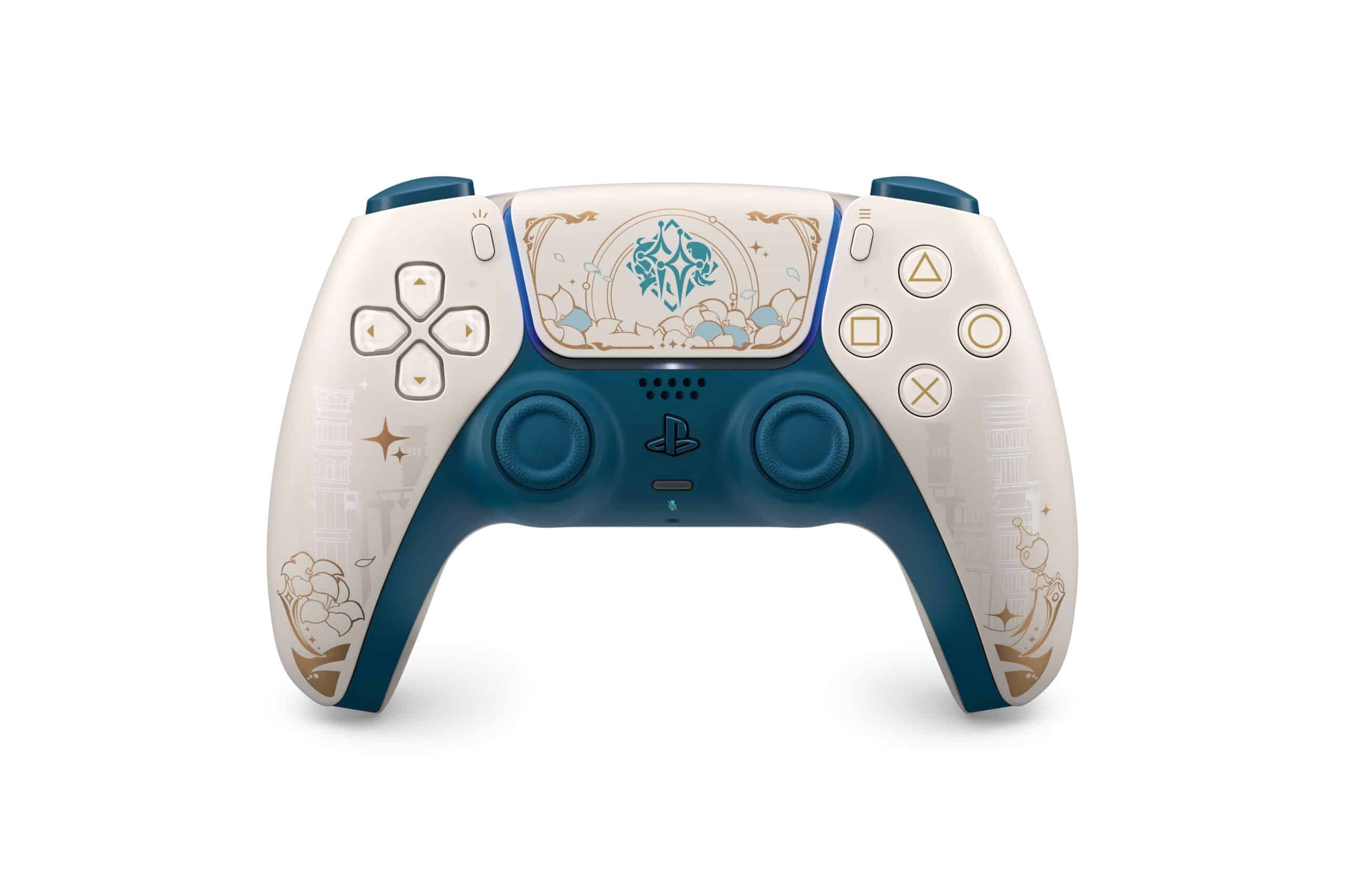 คอนโทรลเลอร์ไร้สายรุ่นนี้มาพร้อมกับสีพิเศษอย่าง สีขาว (Ethereal white) , สีทอง, และ สีเขียว ซึ่งได้รับการตกแต่งด้วย อักขระ Arcane glyphs จากอาณาจักรแฟนตาซี รวมถึงตราสัญลักษณ์ ของนักเดินทางฝาแฝดอย่าง Aether และ Lumine และไกด์นำทางคู่ใจ Paimon