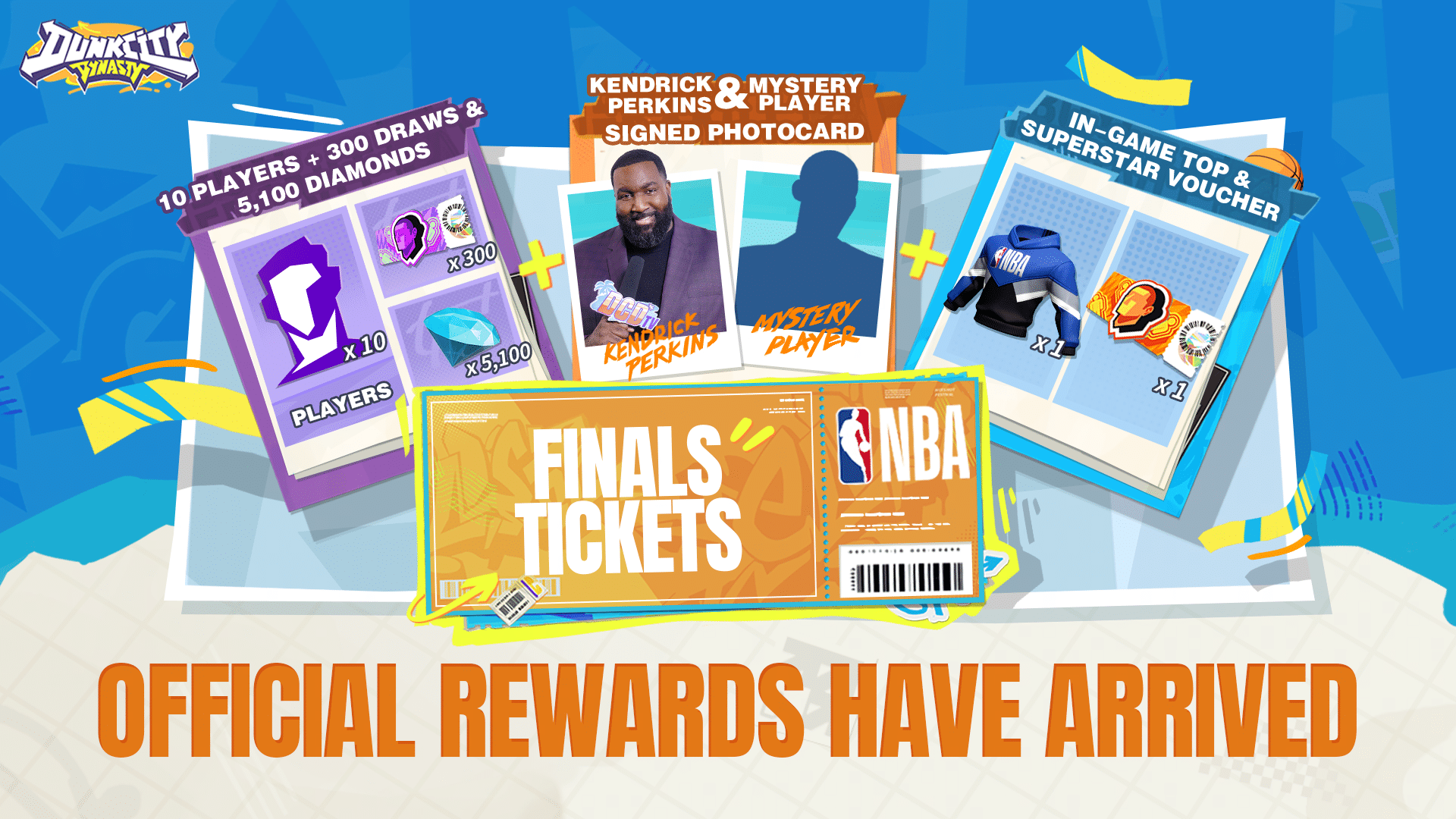 ในการประกาศข่าววันนี้ Dunk City Dynasty ยังมาพร้อมกิจกรรมแจกของรางวัลมากมาย เช่น โอกาสลุ้นรับตั๋วเข้าชมรอบชิงชนะเลิศ NBA เพียงแชร์โพสต์ประกาศวันเปิดตัว และชวนเพื่อนลงทะเบียนเพื่อรับชุดเครื่องแต่งกายสุดพิเศษภายในเกม! นอกจากนี้ แฟนบาสเกตบอลยังสามารถร่วมลุ้นรางวัลสุ่มผู้เล่นดาวเด่น 10 คน, สิทธิ์สุ่มไอเท็ม 300 ครั้ง, เงินในเกม, รวมถึงภาพถ่ายพร้อมลายเซ็นจากเคนดริก เพอร์กินส์และผู้เล่นปริศนาอีกด้วย!