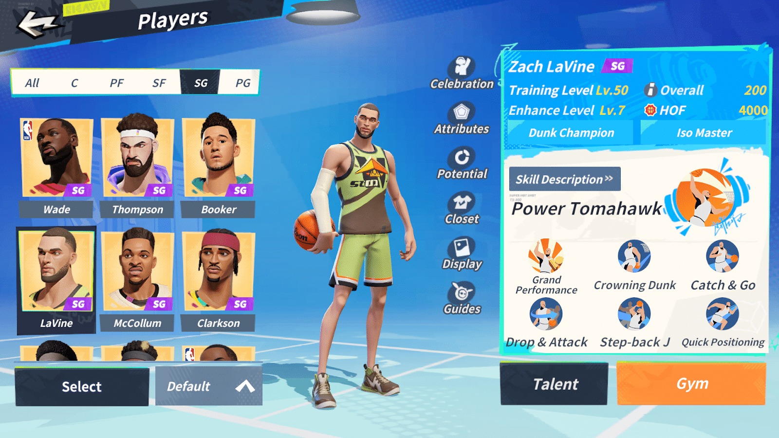 สกิลอัลติเมตของเขา “Power Tomahawk” ช่วยให้ LaVine สามารถทำดังก์มือเดียวอย่างรุนแรงได้ และหากไม่มีผู้เล่นฝ่ายตรงข้ามมาขวาง ก็จะเป็น “Poster Dunk” ที่รับประกันการทำคะแนนแน่นอน ส่วนสกิล “Grand Performance” จะช่วยเพิ่มความเร็วในการดังก์ทั้งหมดของเขา และมอบความได้เปรียบในการปะทะกับผู้เล่นฝ่ายรับ โดยสามารถสะสมได้สูงสุด 3 ครั้งเพื่อลดระยะที่ถูกป้องกัน