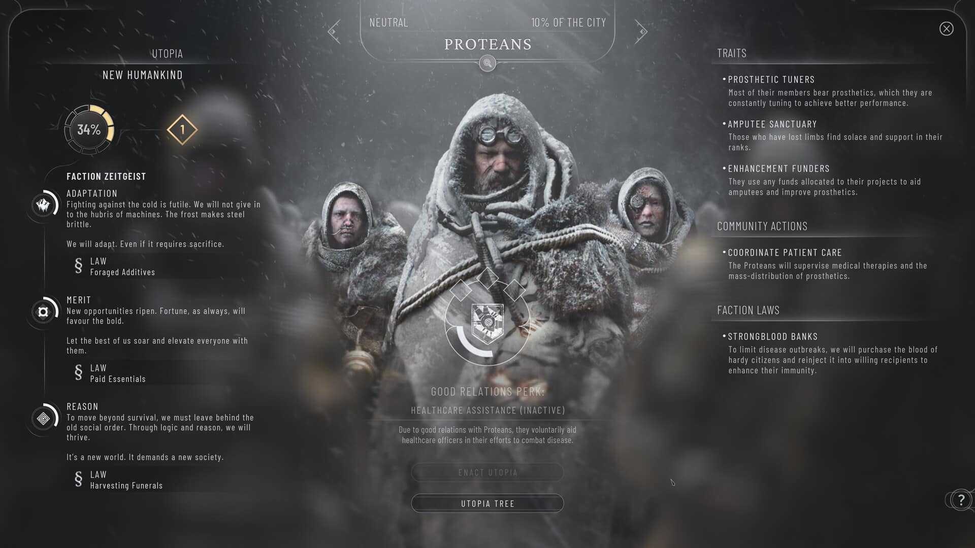 เมื่อปลดล็อกโหนดทั้งหมดใน Utopia Tree ผู้เล่นจะสามารถออกนโยบายเพื่อสร้างวิสัยทัศน์หนึ่งเดียวให้ทั้งเมือง ผูกมัดสังคมทั้งหมดเข้ากับเส้นทางที่เลือก และยุติความตึงเครียดทั้งมวลอย่างถาวร