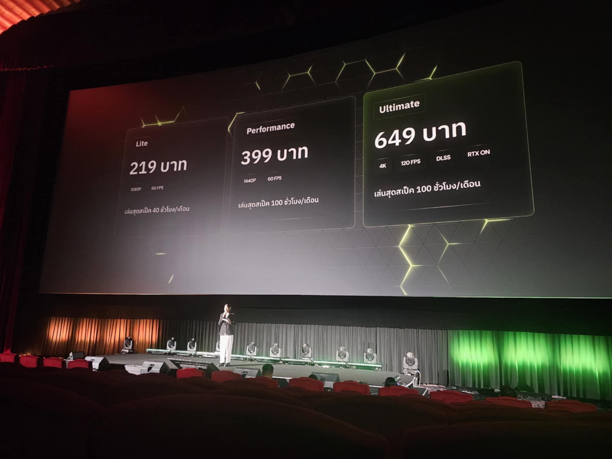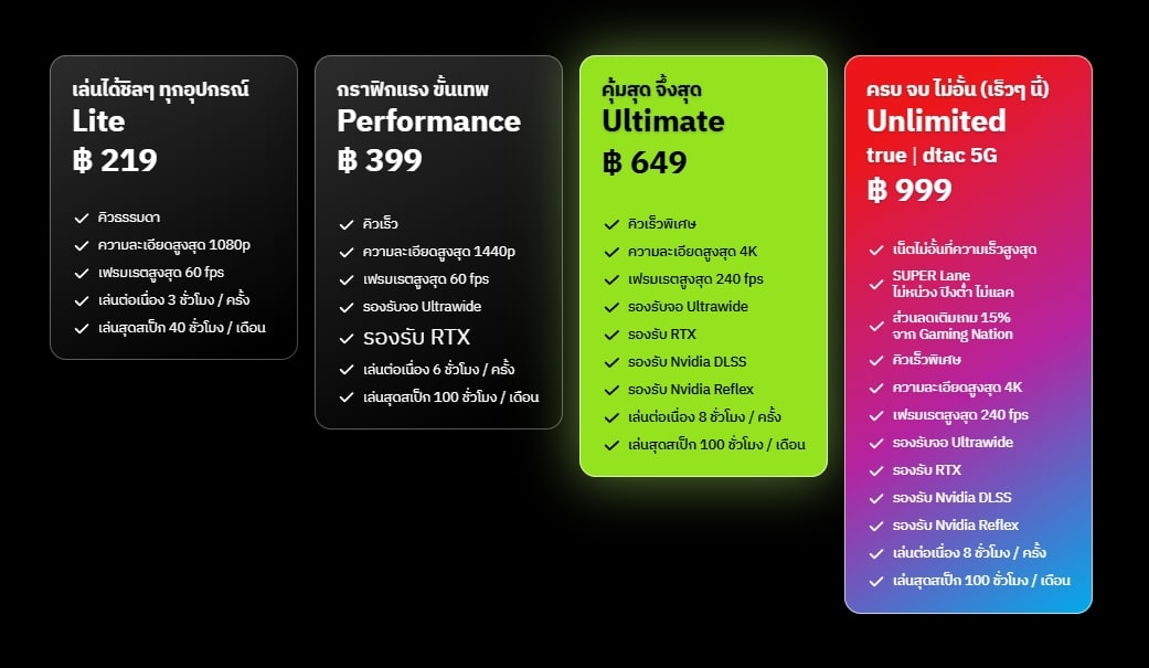 GeForce NOW มาพร้อมระบบเซิร์ฟเวอร์ที่ตั้งอยู่ในประเทศไทยผ่านความร่วมมือกับ Telehouse Thailand เพื่อมอบประสบการณ์เล่นเกมที่ภาพสวย ลื่นไหล ลดความหน่วง ปิงต่ำและไม่กระตุก พร้อมการเชื่อมต่อกับผู้ให้บริการอินเทอร์เน็ต (ISP) รายใหญ่ของประเทศ เช่น TRUE DTAC และ AIS โดยแบ่งแพ็กเกจสมาชิกออกเป็น 3 ระดับ ได้แก่ Lite, Performance และ Ultimate โดยมีราคาเริ่มต้นเพียงเดือนละ 219 บาท ผู้ใช้สามารถเลือกแพ็กเกจตามสไตล์การเล่นของตนเอง และยังสามารถทดลองใช้งานฟรีได้ภายในงานเปิดตัว รวมถึงรับสิทธิพิเศษจากพันธมิตรชั้นนำในวงการเกมและเทคโนโลยี
