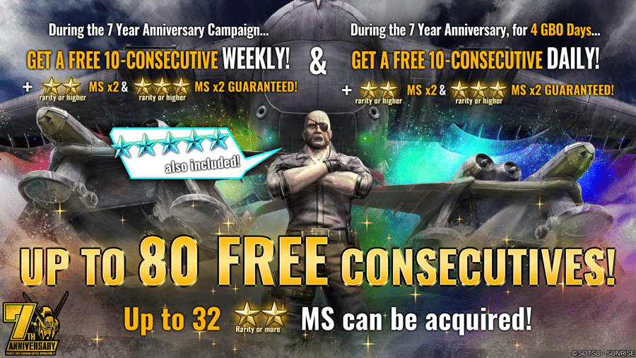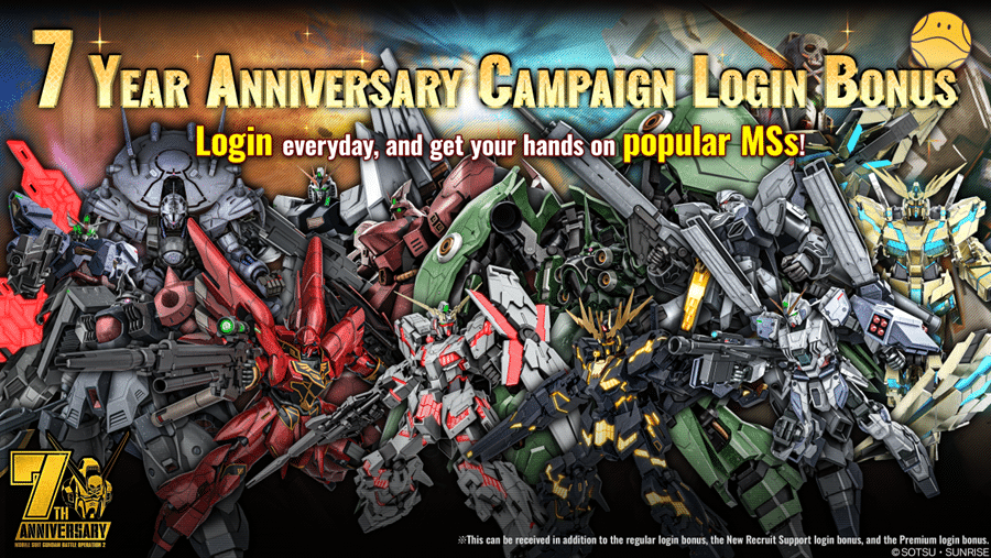 – โบนัสล็อกอินฉลองครบรอบ 7 ปี ที่มีโอกาสได้รับ MS ★★★★ เช่น Unicorn Gundam Lv.1 และ Banshee Lv.1