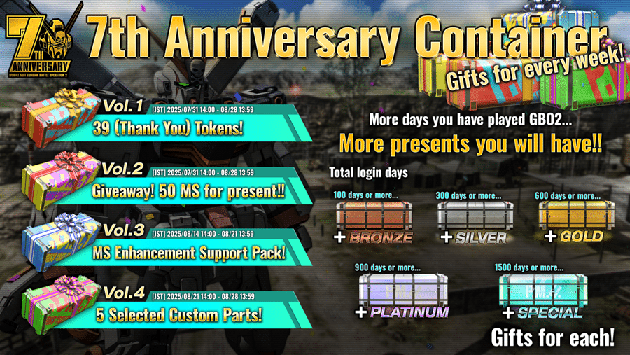 ขอขอบคุณการสนับสนุนจากนักบินผู้ทุ่มเททั่วโลก MOBILE SUIT GUNDAM BATTLE OPERATION 2 กำลังฉลองครบรอบ 7 ปี เพื่อเป็นการเฉลิมฉลองครั้งนี้ แคมเปญฉลองครบรอบ 7 ปีจะเริ่มตั้งแต่เวลา 13:00 น. ตามเวลาสิงคโปร์ (SGT) ในวันพฤหัสบดีที่ 31 กรกฎาคม 2025