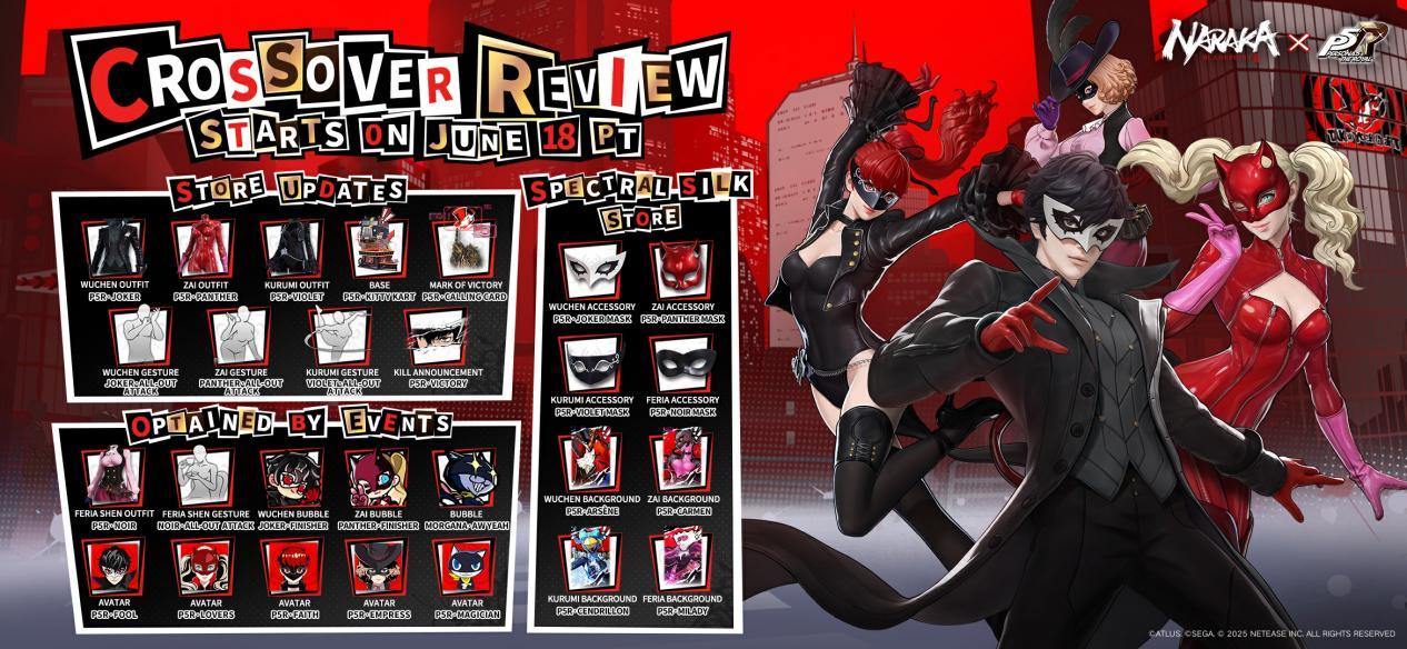 ความร่วมมือนี้เริ่มต้นในวันที่ 18 มิถุนายน 2025 โดยจะนำตัวละครยอดนิยมอย่าง Ann Takamaki, Kasumi Yoshizawa, Haru Okumura และ Ren Amamiya เข้าสู่จักรวาลของ Naraka: Bladepoint ผ่านการร่วมมือด้านชุดคอสตูม ที่จะเปลี่ยนลุค ikonic ของพวกเขาให้เข้ากับเกมแอ็กชันการต่อสู้ระยะประชิดที่เต็มไปด้วยความเร็ว