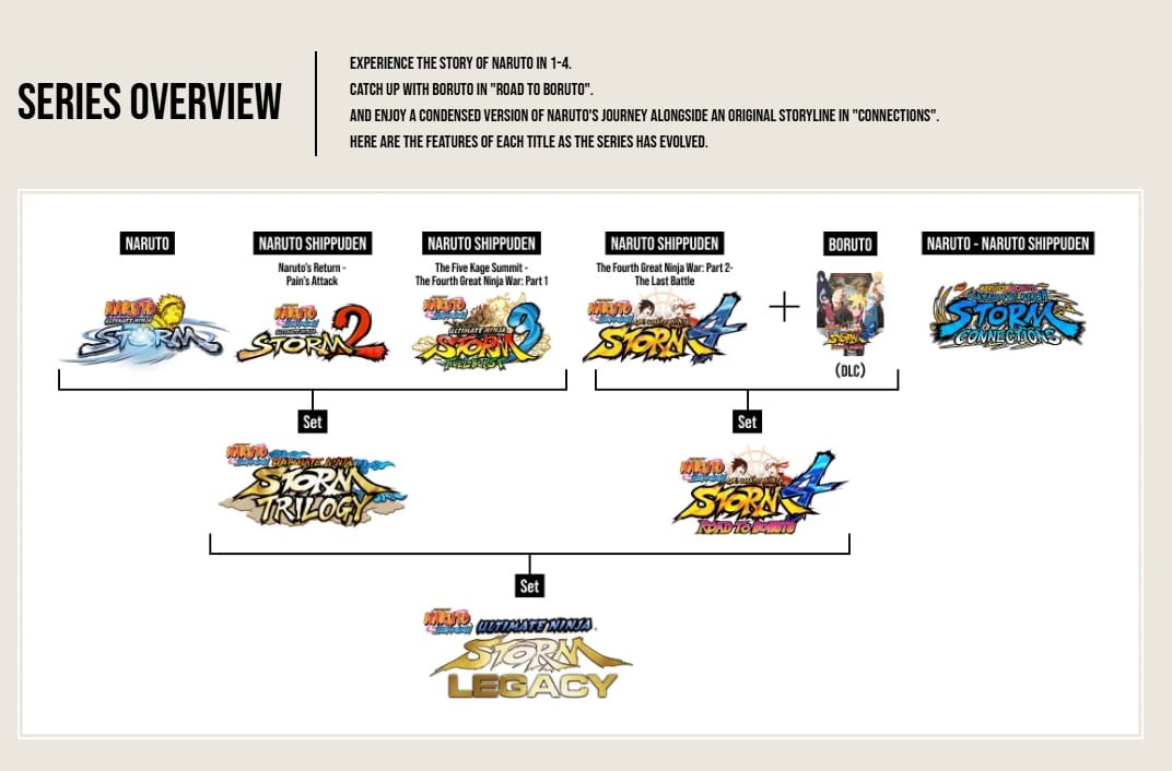 ซีรีส์ Naruto Ultimate Ninja Storm คือเกมต่อสู้แอ็กชันของเหล่านินจาที่มียอดขายทั่วโลกมากกว่า 30 ล้านชุด มาพร้อม “Super Anime Expression” ที่ทำให้ภาพสไตล์อนิเมะมีชีวิตโลดแล่น ผู้เล่นจะได้สัมผัสเรื่องราวสุดยิ่งใหญ่ตั้งแต่นารูโตะจนถึงโบรูโตะ รวมถึงการต่อสู้อันทรงพลังที่เต็มไปด้วยนินจุสึพุ่งว่อนทุกทิศทาง