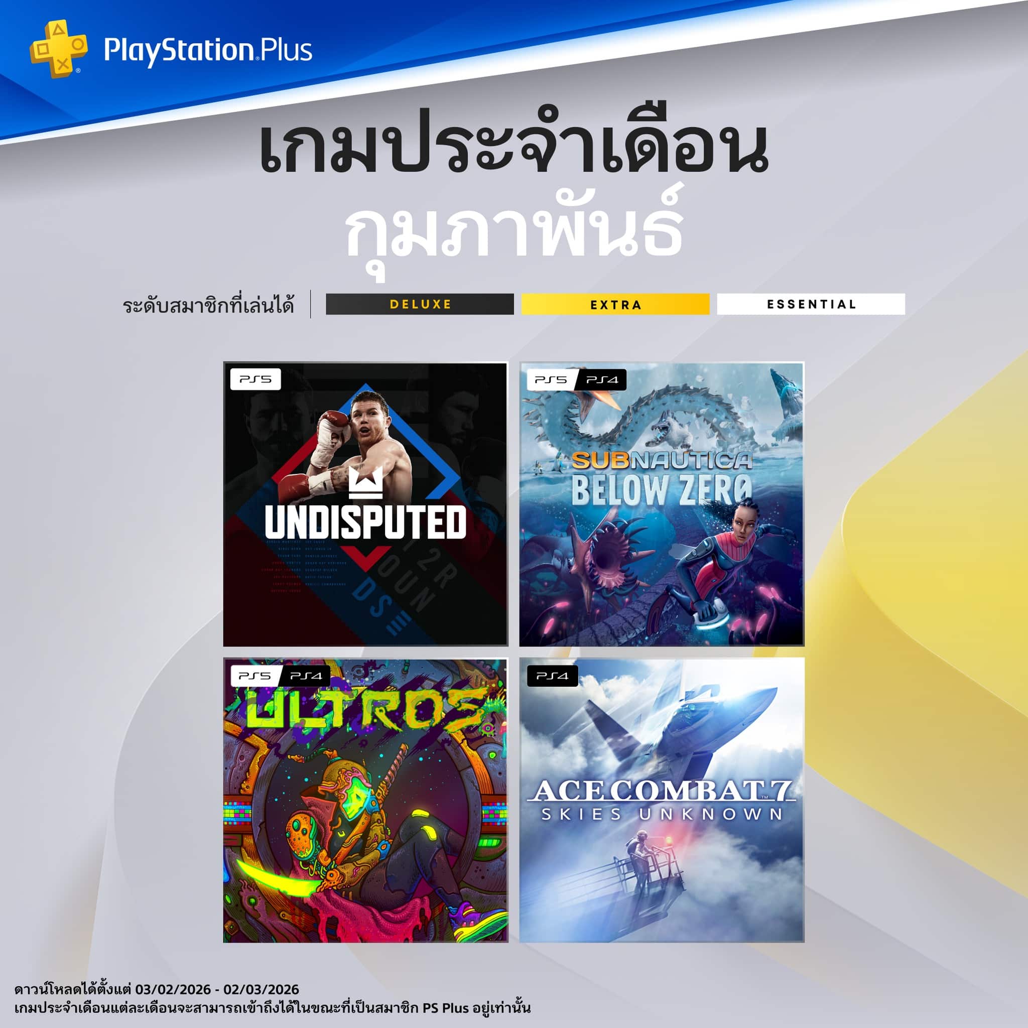 ทั้งนี้สมาชิกทั้งรูปแบบ Deluxe, Extra และ Essential สามารถกดรับและดาวน์โหลดเกมแจกฟรีด้านบนของเดือนกุมภาพันธ์ได้ทั้งหมด ซึ่งเกมฟรีในแต่ละเดือนจะสามารถเข้าถึงได้ในขณะที่เป็นสมาชิก PlayStation Plus อยู่เท่านั้น โดยสามารถเข้าไปดูรายละเอียดเพิ่มเติมที่ https://www.playstation.com/th-th/ps-plus
