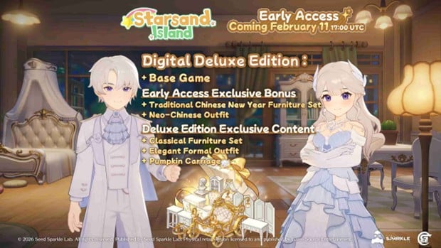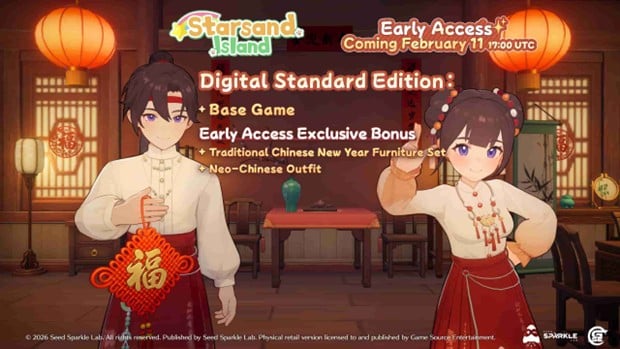 หลังจากที่เกม Starsand Island ได้ไปร่วมงาน Taipei Game Show 2026 ที่ผ่านมา ทางทีมพัฒนา Seed Sparkle Lab ได้ออกมาขอบคุณชุมชนผู้เล่นสำหรับการสนับสนุนอย่างล้นหลาม พร้อมประกาศอย่างเป็นทางการว่าเกมจะเข้าสู่ช่วง Early Access บน PC Steam ในวันที่ 11 กุมภาพันธ์ 2026 ซึ่งตรงกับช่วงเทศกาลตรุษจีนพอดี พร้อมกันนี้ยังมีการเปิดเผย โบนัสพิเศษสำหรับการเปิดตัวเวอร์ชัน Deluxe อีกด้วย