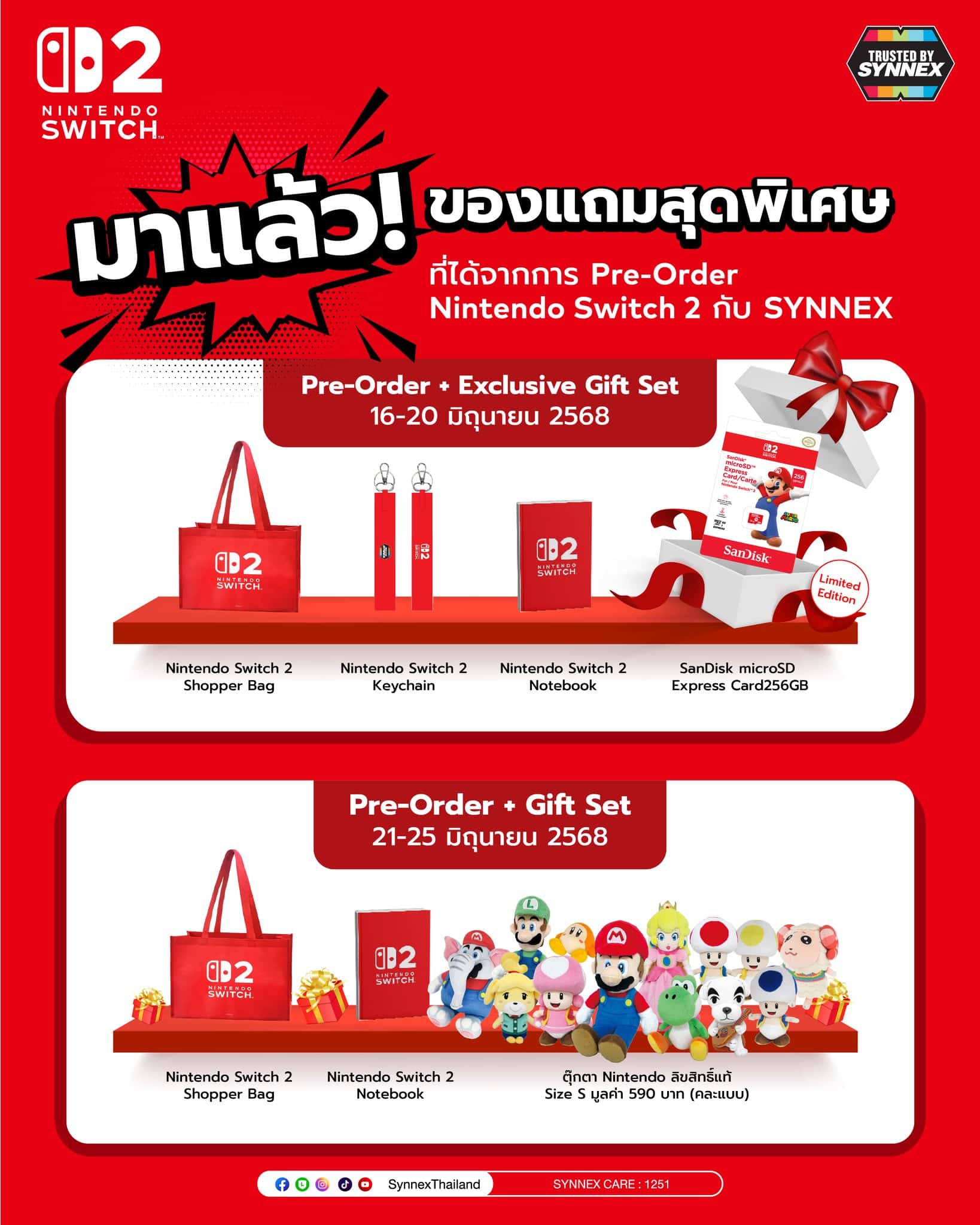 ช่วงพรีออเดอร์รอบแรก (16 – 20 มิถุนายน 2568): รับชุดของขวัญสุดเอ็กซ์คลูซีฟ ประกอบด้วย SanDisk microSD Express Card 256GB for Nintendo Switch 2, Shopper Bag, Keychain, Notebook สมุดปก Nintendo และ E-voucher มูลค่า 500 บาท *บนเงื่อนไขที่กำหนด