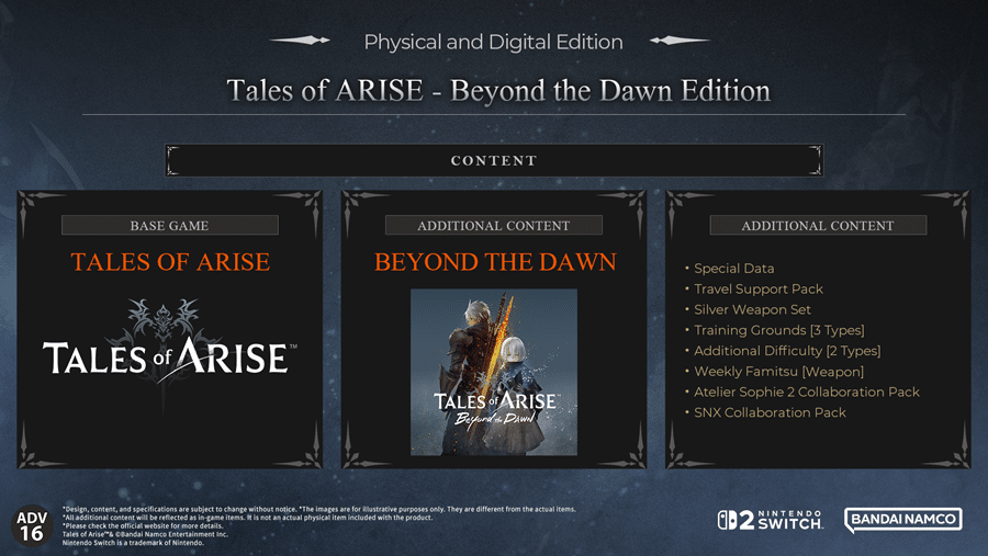 Tales of ARISE – Beyond the Dawn Edition ประกอบด้วยตัวเกมหลัก Tales of ARISE, เนื้อหาเสริมขนาดใหญ่ Beyond the Dawn, เควสต์พิเศษที่เน้นเรื่องราวของตัวเอกและนางเอก รวมถึงไอเทมภายในเกมหลากหลายรายการที่สามารถใช้งานได้ ช่วยเพิ่มประสบการณ์การผจญภัยให้สมบูรณ์ยิ่งขึ้น