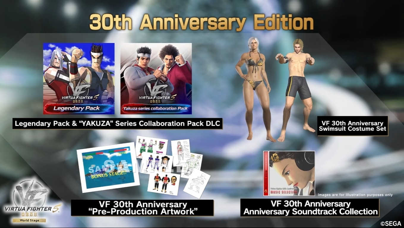 อีกทั้งกำลังเปิดให้สั่งจอง “30th Anniversary Edition” ซึ่งเป็นเวอร์ชันพิเศษฉลองครบรอบ 30 ปีของ Virtua Fighter อยู่ด้วย อัดแน่นด้วยไอเทมมากมาย เช่น คอสตูมชุดว่ายน้ำฉลองครบรอบ 30 ปี, เอกสารรวมข้อมูลร่างเกมที่แฟนๆ ห้ามพลาด และซาวด์แทร็กที่หาได้จากที่นี่เท่านั้น